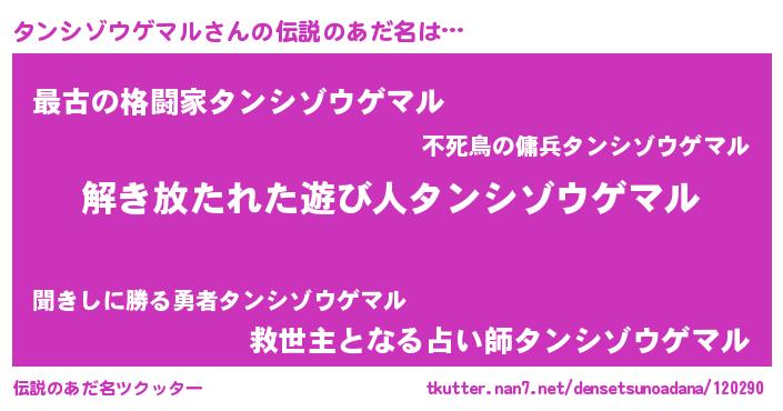 | 男性向けラノベタイトル風あだ名 | 『ダンジョンにタンシゾウゲマルを求めるのは間違っているだろうか』 |