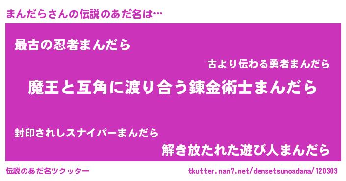 | ヒーロー風カッコイイあだ名 | 『最強戦士マンダラ』『仮面マンダー』 |