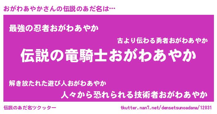 | 女子向けラノベタイトル風あだ名 | 『おがわあやかが死なない童話 林檎のおがわあやかの診療簿』 |