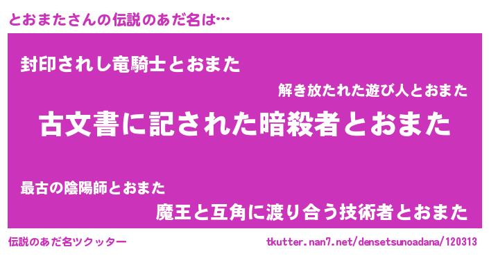 | 胡散臭い通販商品みたいなあだ名 | 『前代未聞の健康食品…その名も「とおまた」』 |