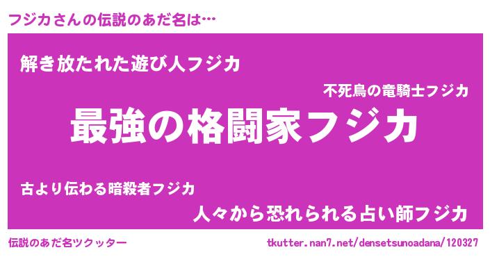 | 男性向けラノベタイトル風あだ名 | 『Re:フジカから始める異世界生活』 |