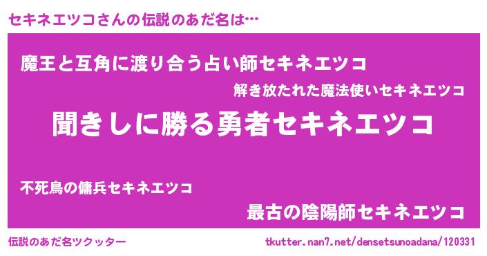 | 男性向けラノベタイトル風あだ名 | 『セキネエツコという概念が存在しない退屈な世界 』 |