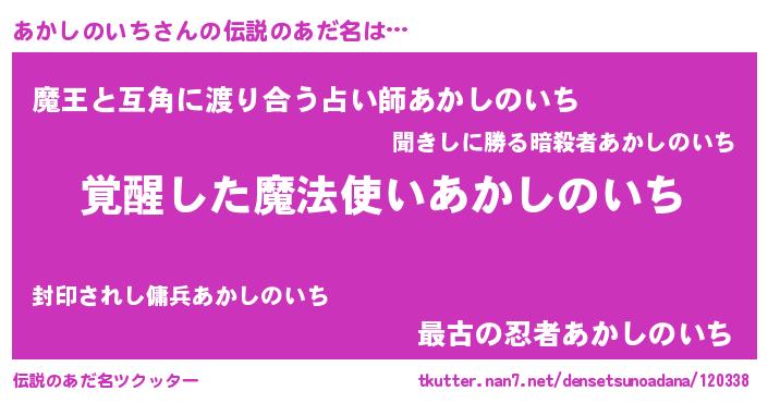 | ヒーロー風カッコイイあだ名 | 『最強戦士アカシノイチ』『幻影騎士アカ』 |
