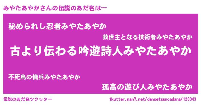 | ヒーロー風カッコイイあだ名 | 『ネオミヤタアヤカ』『暗黒騎士ミヤ』 |