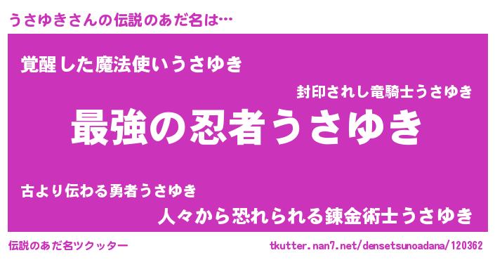 | ヒーロー風カッコイイあだ名 | 『ウルトラうさゆきマン』『天弓騎士ウサ』 |
