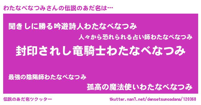 | 男性向けラノベタイトル風あだ名 | 『ワタナベナツミアートオンライン』 |