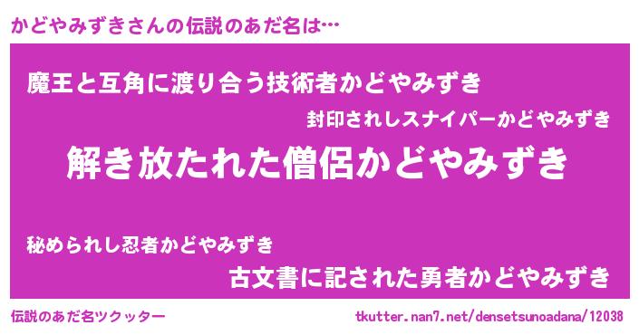 | 男性向けラノベタイトル風あだ名 | 『かどやみずきの嫁は女の子じゃないと思った?』 |
