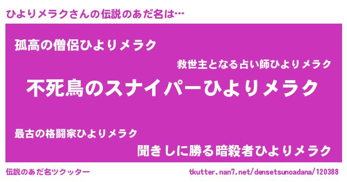 | 意味不明あだ名 | 『住所不定無職ひよりメラク(85歳)』 |