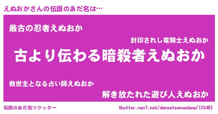 | ヒーロー風カッコイイあだ名 | 『ネオエヌオカ』『ウルトラえぬおかマン』 |