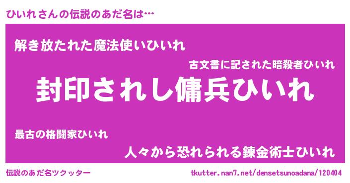 | 男性向けラノベタイトル風あだ名 | 『この素晴らしい世界にひいれを!』 |