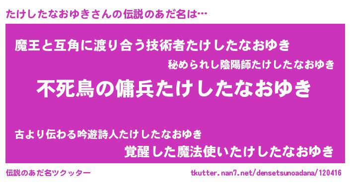 | 男性向けラノベタイトル風あだ名 | 『たけしたなおゆきに滅ぼされるだけの簡単なお仕事です』 |