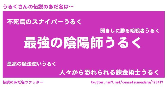 | 男性向けラノベタイトル風あだ名 | 『うちのうるくが世界を掌握している!』 |