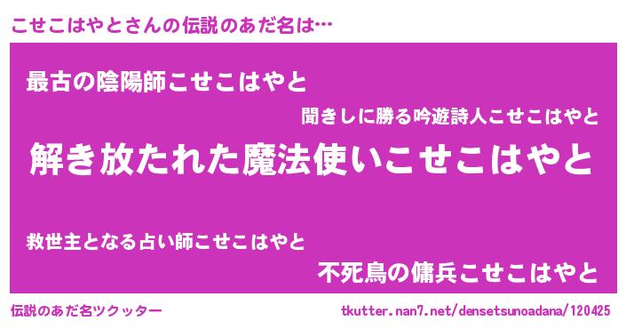 | 肩書あだ名 | 『こせこはやと団長』『こせこはやと中尉』 |