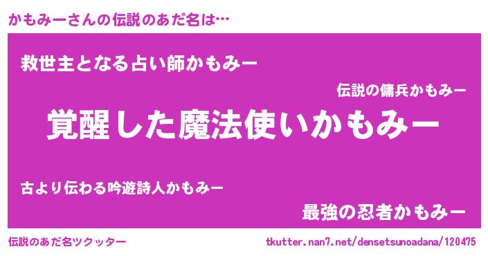 | 男性向けラノベタイトル風あだ名 | 『かもみーに滅ぼされるだけの簡単なお仕事です』 |
