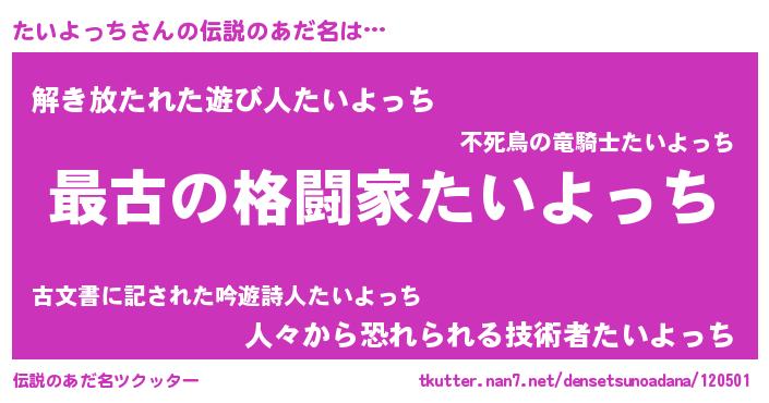 | 男性向けラノベタイトル風あだ名 | 『たいよっちに滅ぼされるだけの簡単なお仕事です』 |