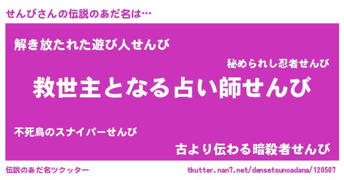 | ヒーロー風カッコイイあだ名 | 『慈愛の使者せんび』『銀牙騎士セン』 |