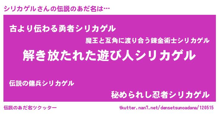 | 男性向けラノベタイトル風あだ名 | 『この素晴らしい世界にシリカゲルを!』 |