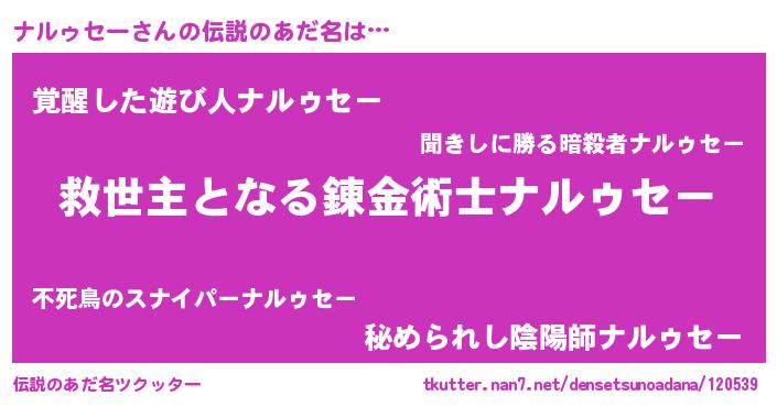 | ヒーロー風カッコイイあだ名 | 『慈愛の使者ナルゥセー』『天弓騎士ナル』 |