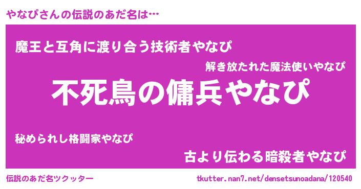 | 女子向けラノベタイトル風あだ名 | 『やなぴ姫と円卓の騎士』『やなぴ恋絵巻』 |