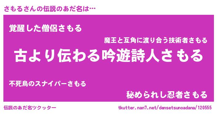 | 男性向けラノベタイトル風あだ名 | 『さもるという概念が存在しない退屈な世界 』 |
