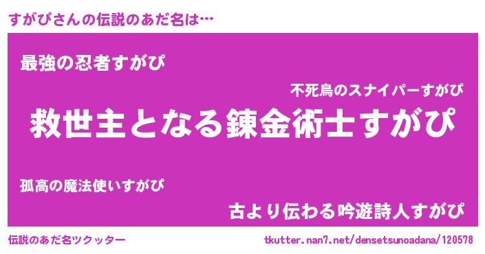| 女子向けラノベタイトル風あだ名 | 『死神すがぴの再婚』『闇のすがぴ』 |