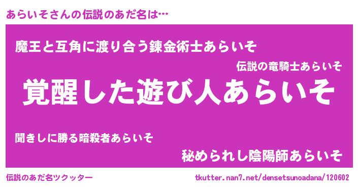 | ヒーロー風カッコイイあだ名 | 『炎刃騎士アラ』『サイバー戦士アライソ』 |