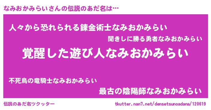 | 男性向けラノベタイトル風あだ名 | 『なみおかみらいに滅ぼされるだけの簡単なお仕事です』 |