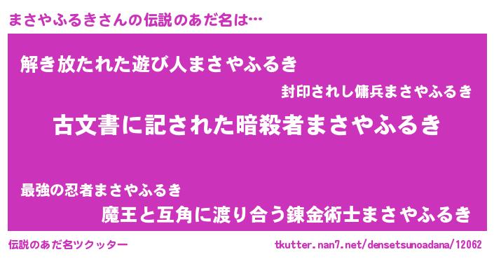 | 男性向けラノベタイトル風あだ名 | 『まさやふるき~年齢イコール彼女いない歴の魔法使い~』 |