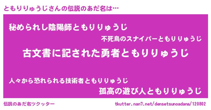 | 男性向けラノベタイトル風あだ名 | 『ともりりゅうじ~年齢イコール彼女いない歴の魔法使い~』 |