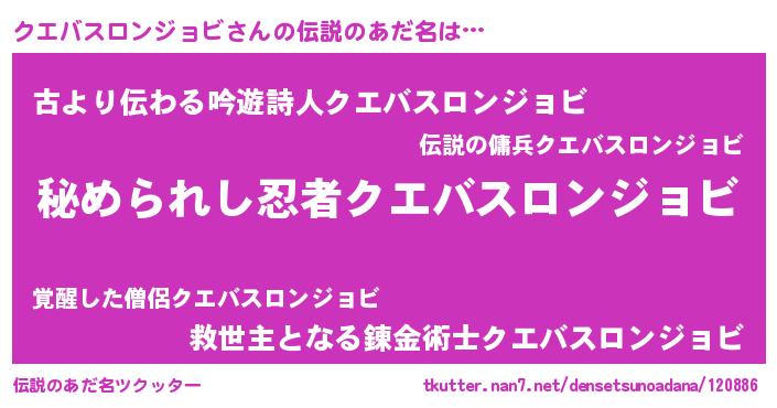| 女子向けラノベタイトル風あだ名 | 『クエバスロンジョビなんてお断りですっ。』 |