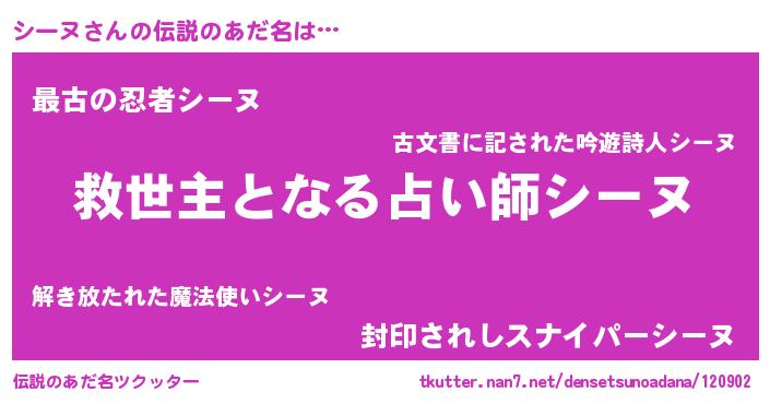 | ヒーロー風カッコイイあだ名 | 『究極戦士シーヌ』『慈愛の使者シーヌ』 |