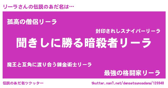 | 女子向けラノベタイトル風あだ名 | 『異世界で失敗しない100のリーラ』 |