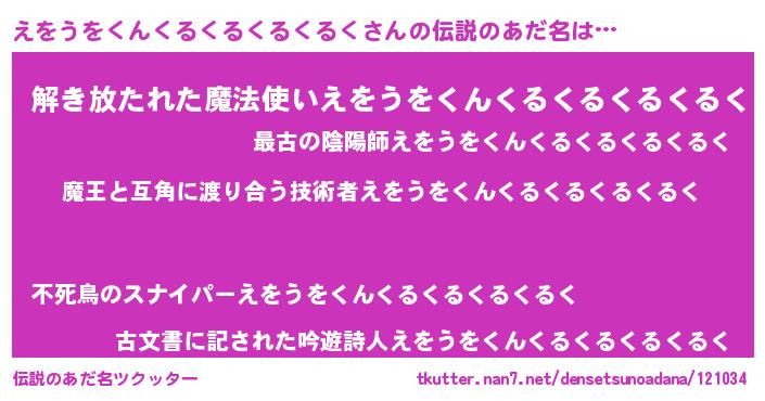 | 男性向けラノベタイトル風あだ名 | 『えをうをくんくるくるくるくるくに滅ぼされるだけの簡単なお仕事です』 |