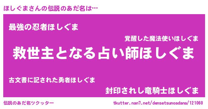 | 男性向けラノベタイトル風あだ名 | 『ほしぐま~年齢イコール彼女いない歴の魔法使い~』 |