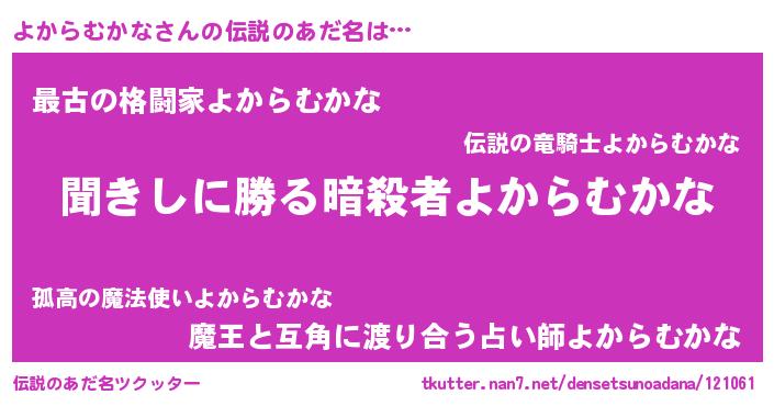 | 胡散臭い通販商品みたいなあだ名 | 『絶対に幸福をもたらす健康食品…その名も「よからむかな」』 |