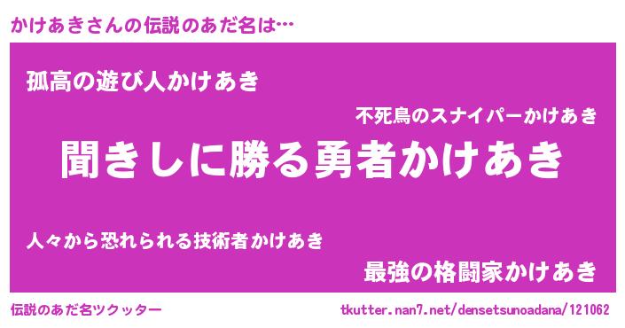 | 男性向けラノベタイトル風あだ名 | 『魔弾の王とかけあき』『緋弾のカケアキ』 |