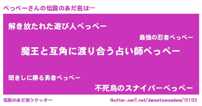 | ヒーロー風カッコイイあだ名 | 『慈愛の使者ぺっぺー』『銀牙騎士ペッ』 |