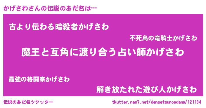| 男性向けラノベタイトル風あだ名 | 『おまえをオタクにしてやるから、俺をかげさわにしてくれ! 』 |