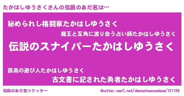 | 男性向けラノベタイトル風あだ名 | 『タカハシユウサクスレイヤー』 |
