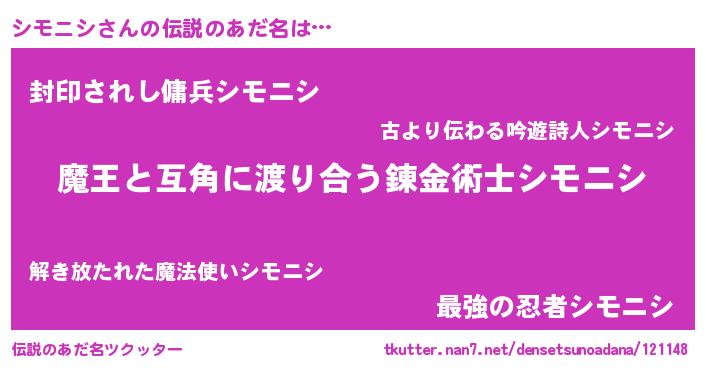 | 男性向けラノベタイトル風あだ名 | 『魔弾の王とシモニシ』 |