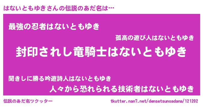 | 胡散臭い通販商品みたいなあだ名 | 『あなたにだけ特別に提供する100年もののヴィンテージワイン…その名も「はないともゆき」』 |