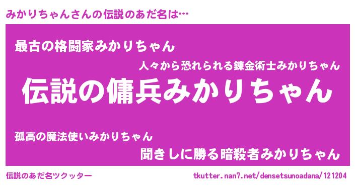 | 女子向けラノベタイトル風あだ名 | 『みかりちゃんなんてお断りですっ。』 |