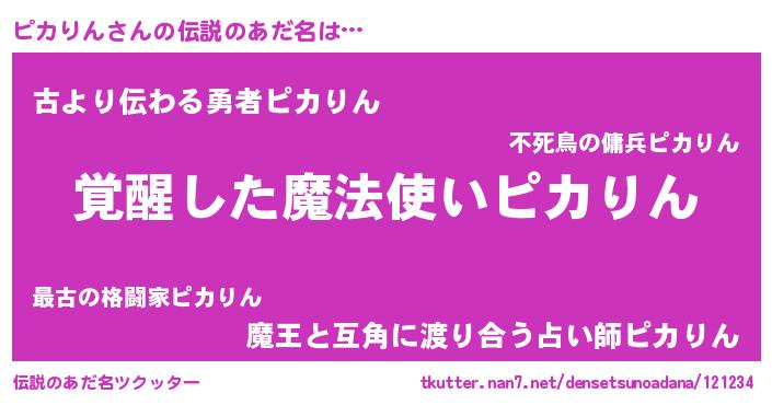 | 男性向けラノベタイトル風あだ名 | 『ピカりんの嫁は女の子じゃないと思った?』 |
