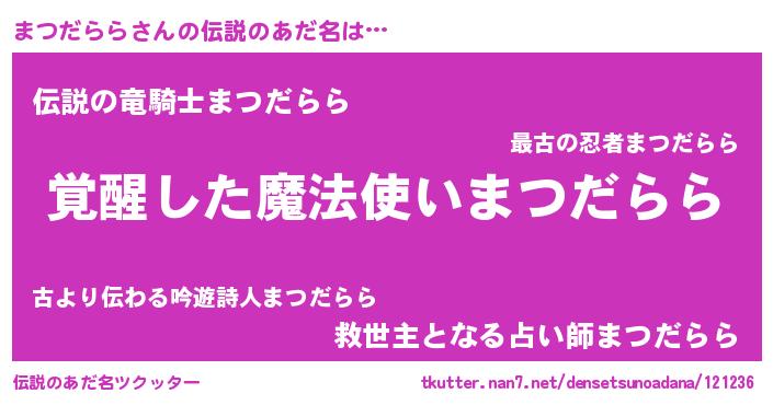 | 男性向けラノベタイトル風あだ名 | 『まつだららの嫁は女の子じゃないと思った?』 |