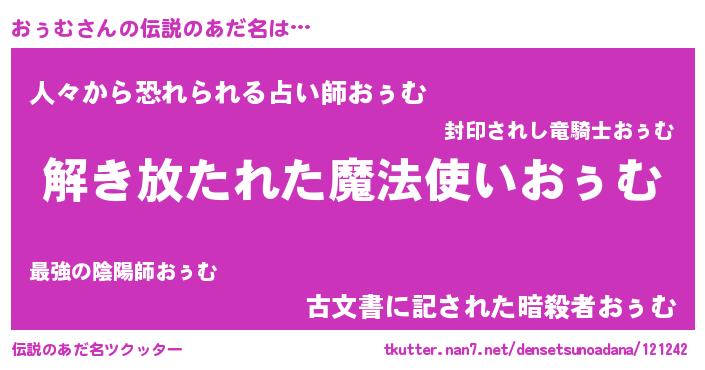 | ヒーロー風カッコイイあだ名 | 『幻影騎士オゥ』『愛の使者おぅむ』 |