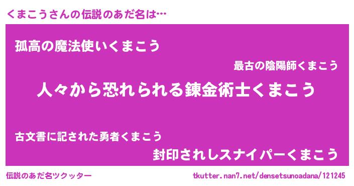 | 男性向けラノベタイトル風あだ名 | 『おまえをオタクにしてやるから、俺をくまこうにしてくれ! 』 |