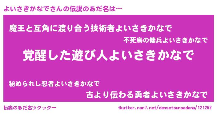 | 男性向けラノベタイトル風あだ名 | 『よいさきかなでの嫁は女の子じゃないと思った?』 |