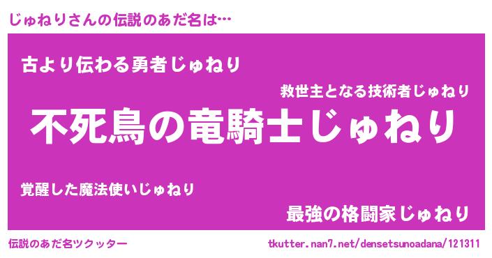 | 女子向けラノベタイトル風あだ名 | 『じゅねり姫と円卓の騎士』 |
