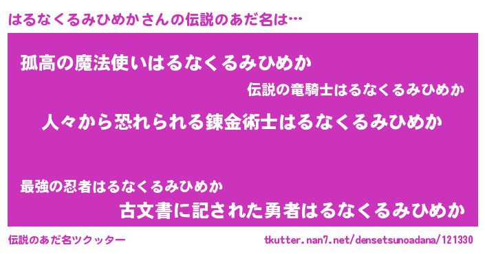 | 男性向けラノベタイトル風あだ名 | 『おまえをオタクにしてやるから、俺をはるなくるみひめかにしてくれ! 』 |