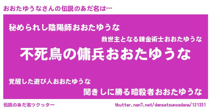 | ヒーロー風カッコイイあだ名 | 『スーパーオオタユウナ』『仮面オオダー』 |
